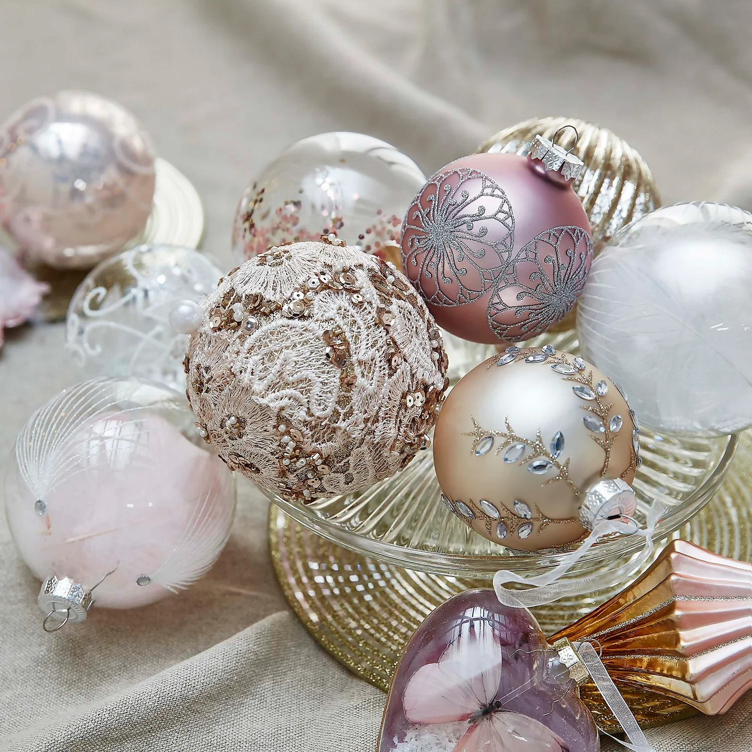 Adding texture to your tree is one way to give it a chic lift. This pretty lace bauble is intricately designed with beading. It’s as pretty as a picture and comes in an elegant champagne tone.