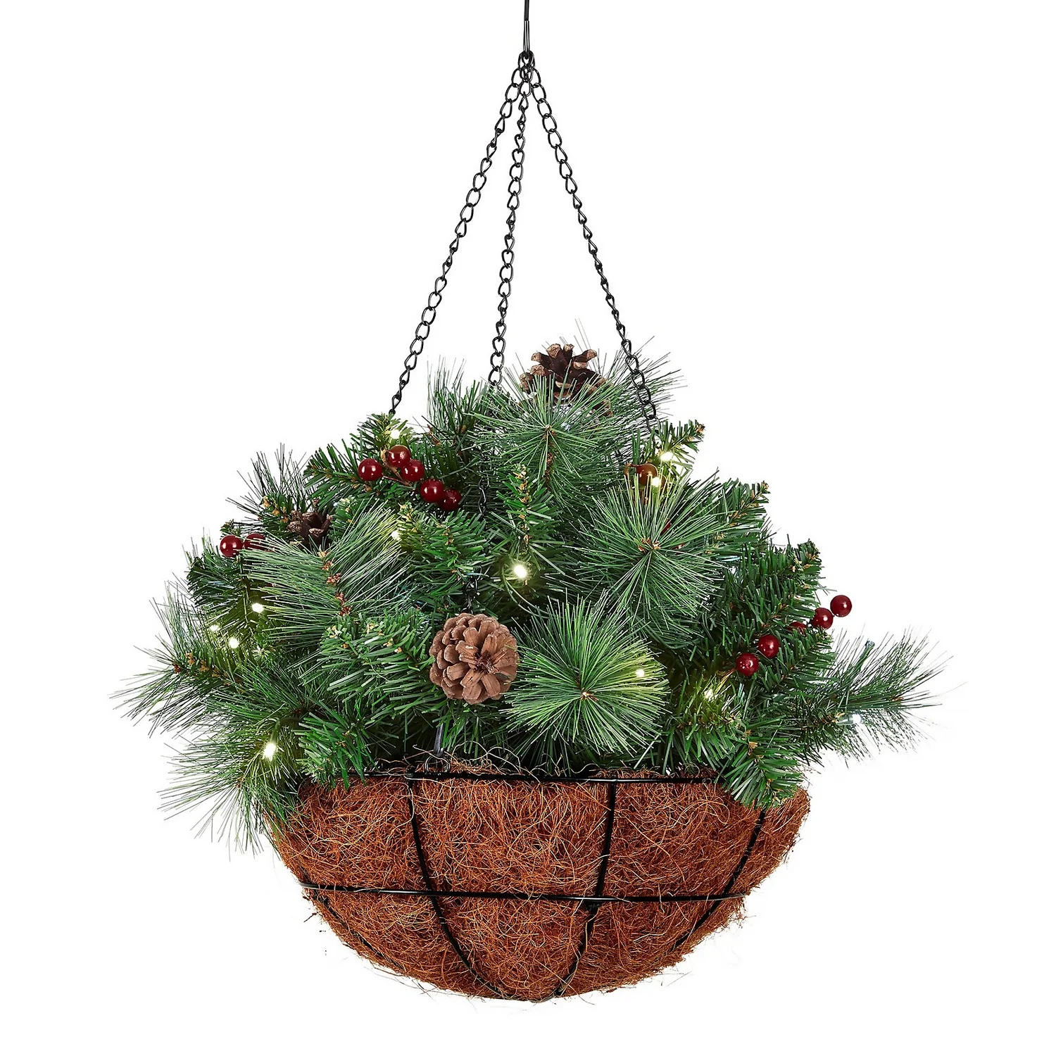 Add some instant festive cheer with out pre-lit Christmas hanging basket. Easy to maintain with faux Christmas foliage, bright red berries and pine-cones, we’ve pre-lit this hanging basket with 35 battery operated warm white lights for a bright and fresh natural look.